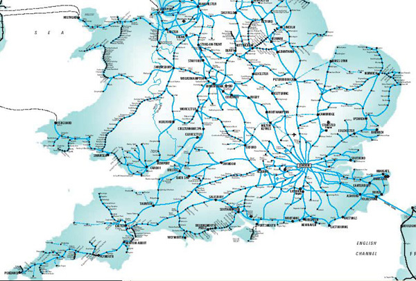 (英國的火車系統,以倫敦為主軸成放射狀鐵路系統;圖片來源:British Railway)